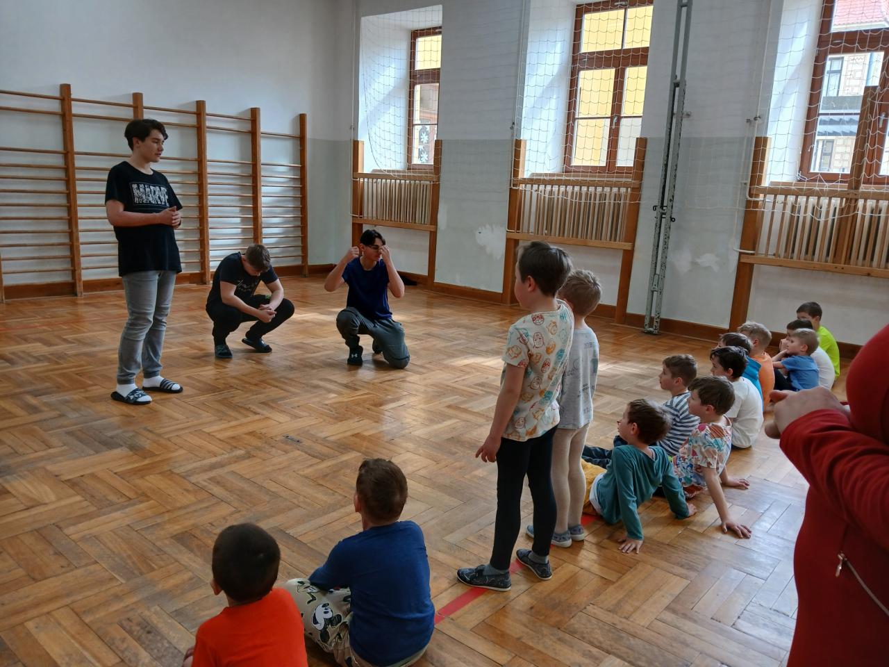 Kluci z osmé třídy si pro kluky připravili cviky a hry v tělocvičně.