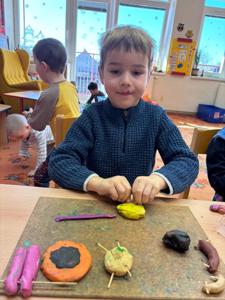 Tvoříme koláče, vlastní masky, modelujeme z plastelíny (jitrnice, koblihy, klobásy), pečeme a ochutnáváme koblihy, zabijačkové hody, pozorujeme masopustní průvod přes projektor, posloucháme cimbálovou muziku, zpíváme veselé písně (Masopust, Já jsem muzikant, Kalamajka), pořádáme karneval na třídě